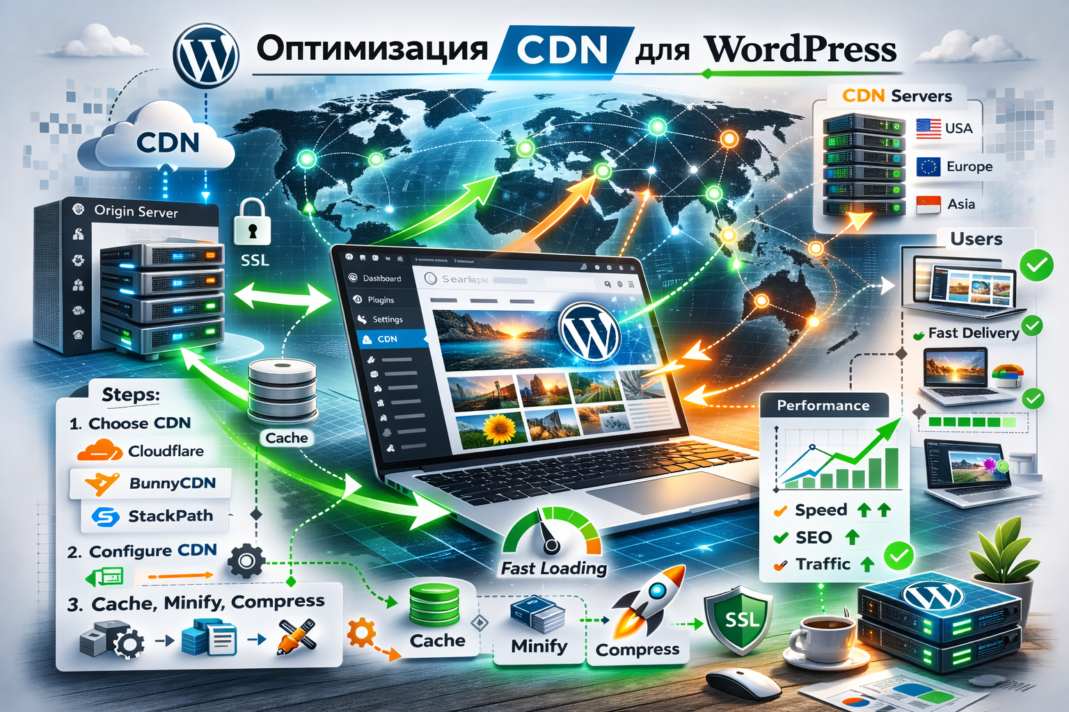 Контент-доставная сеть (CDN) является мощным инструментом для ускорения загрузки веб-сайтов и повышения их производительности. Использование CDNs особенно важно для сайтов, которые получают трафик из разных частей мира или имеют много посетителей одновременно. В этом руководстве мы рассмотрим основные аспекты оптимизации CDN для WordPress.